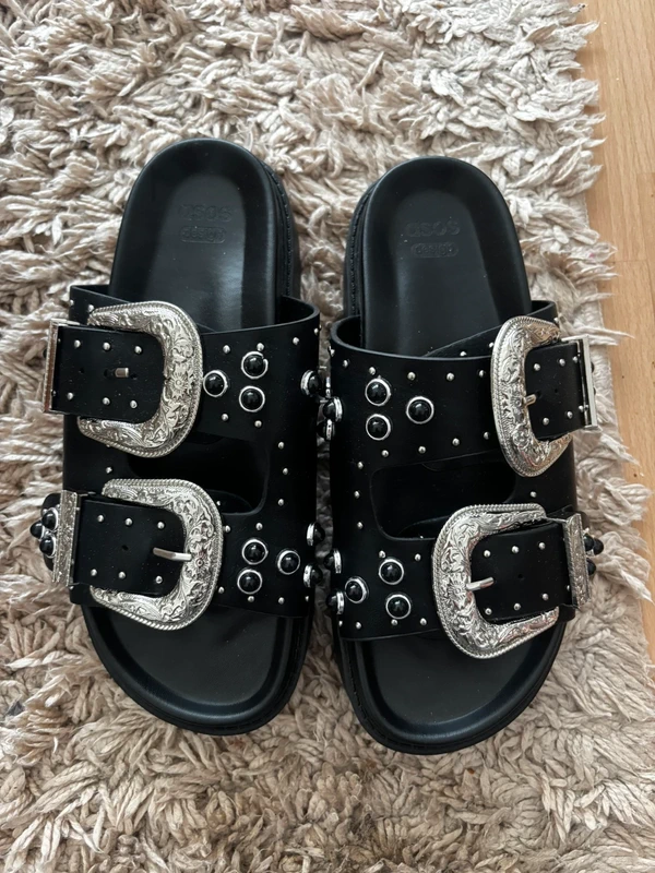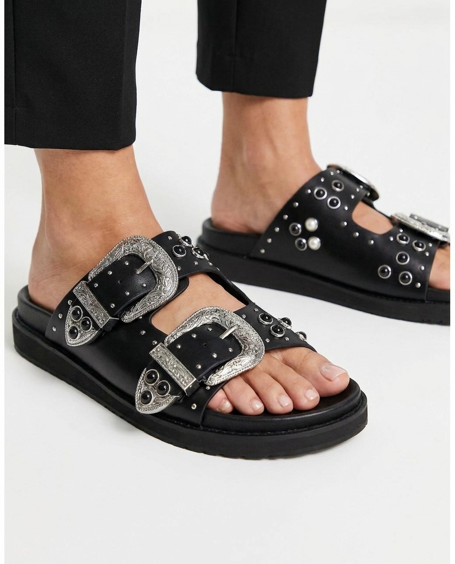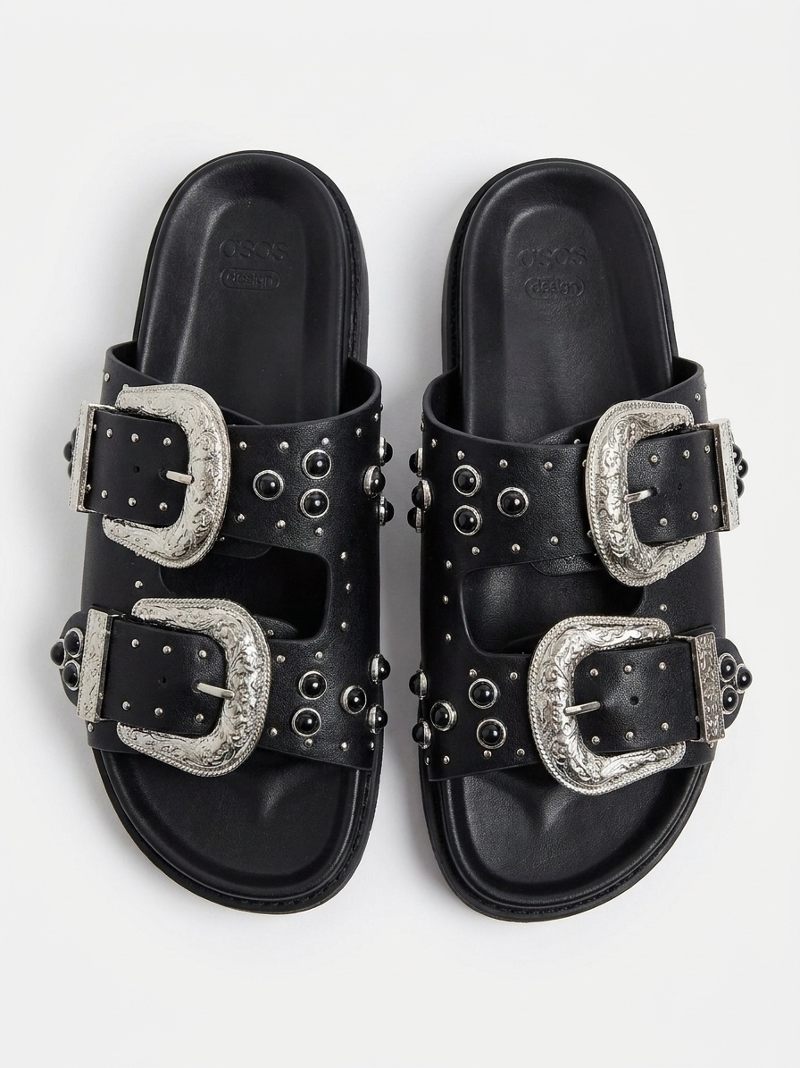 Sandales à deux brides en similicuir noir, agrémentées de boucles western gravées et de clous argentés pour une touche rock. La semelle plateforme légère offre amorti et stabilité, tandis que le lit de pied moulé assure un confort durable.